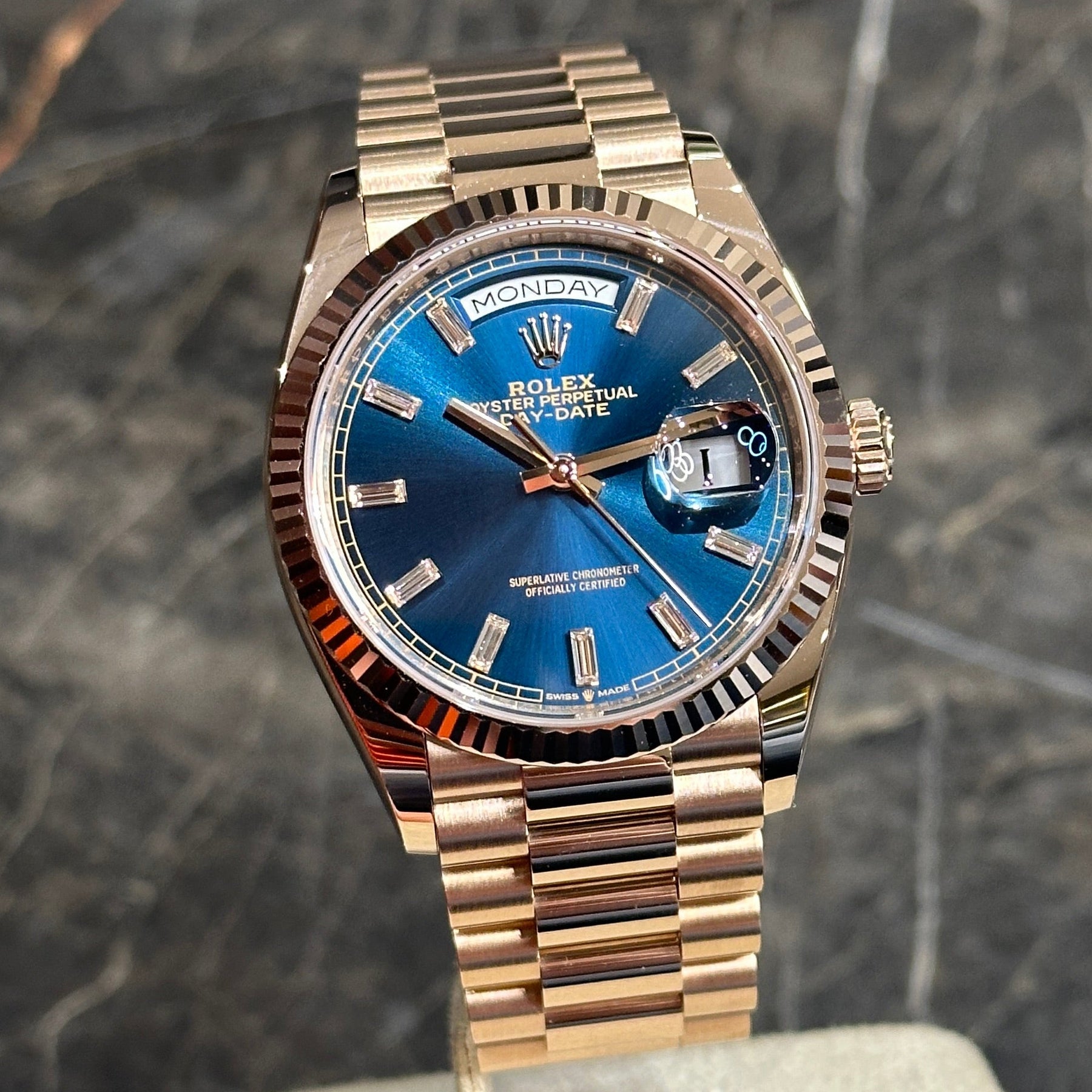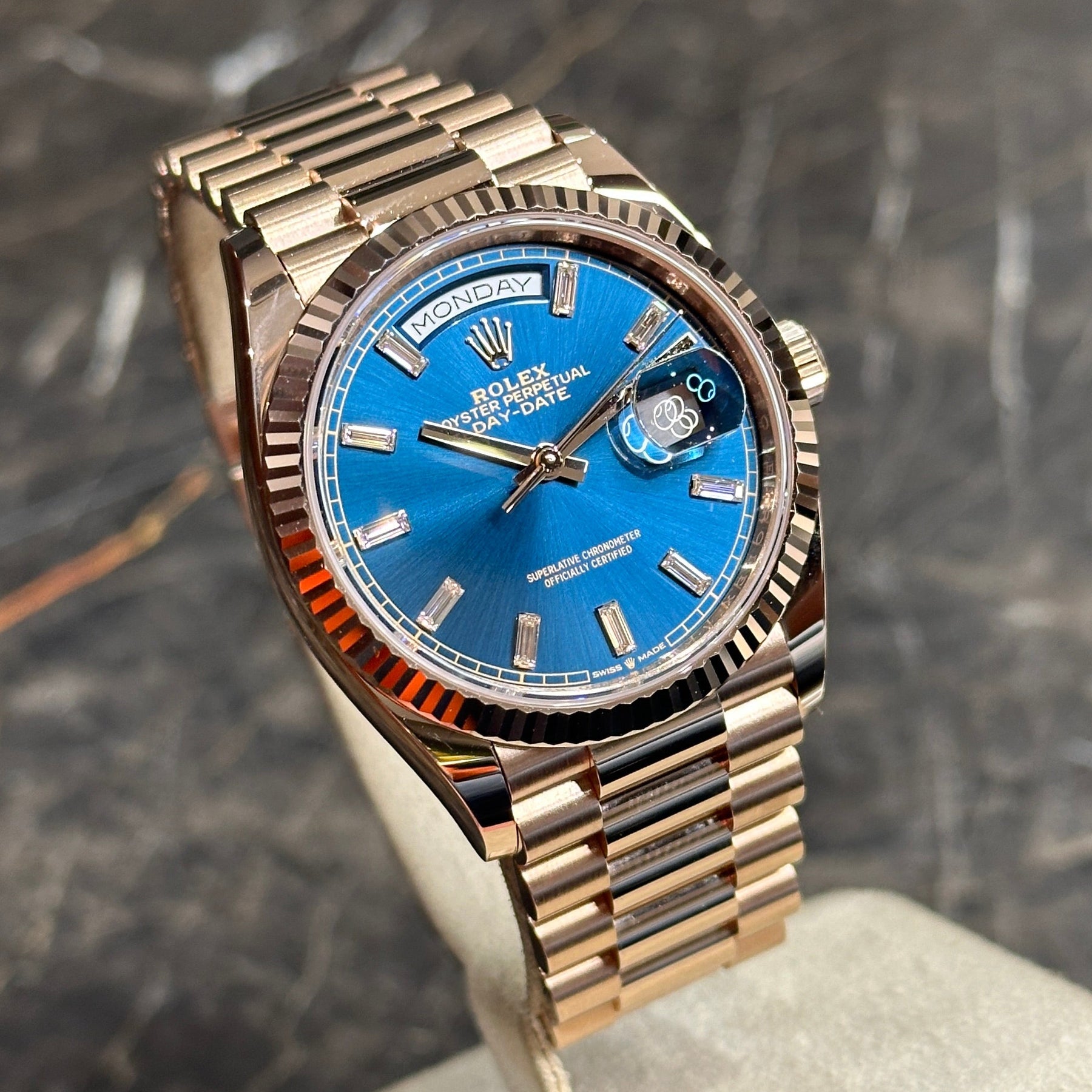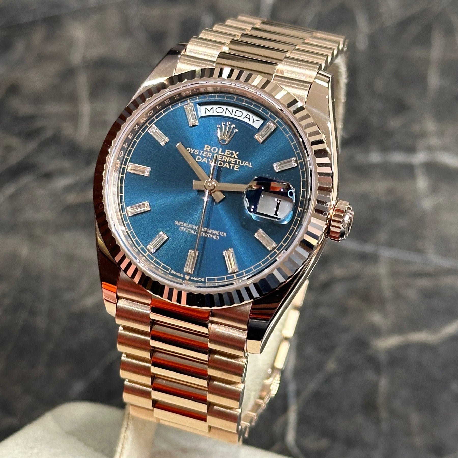 Rolex Day-Date 36 Rose Blue Baguette NEW 12/2024