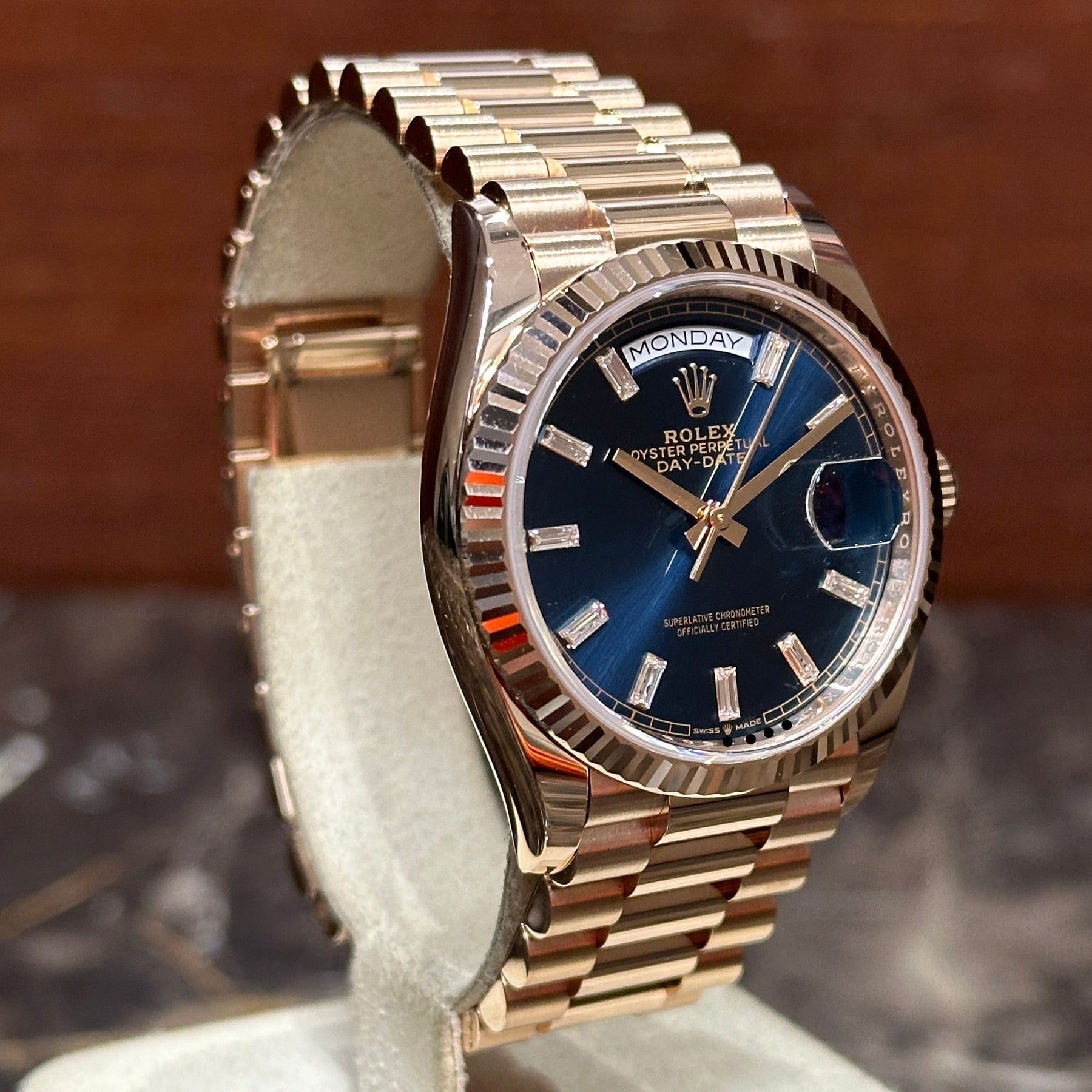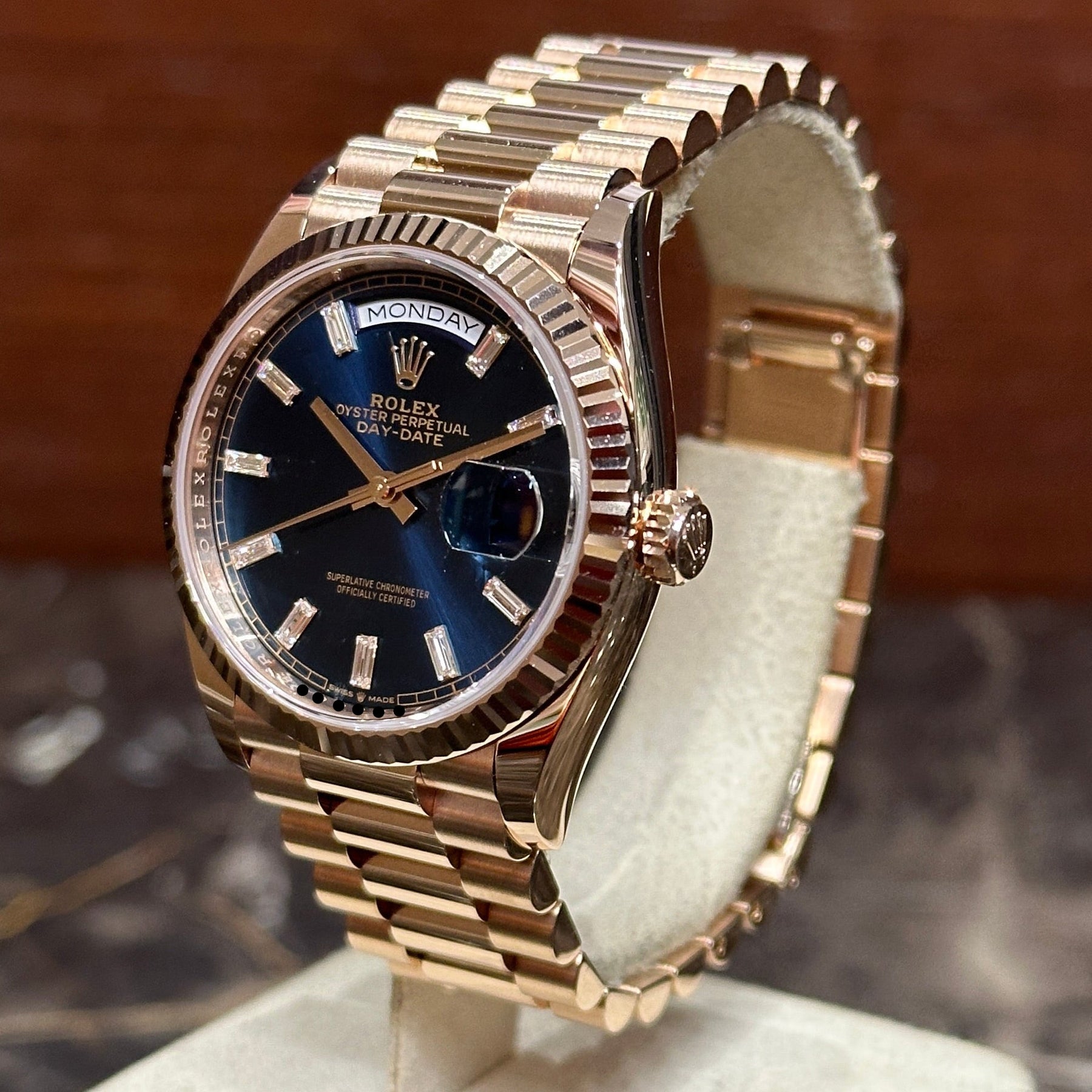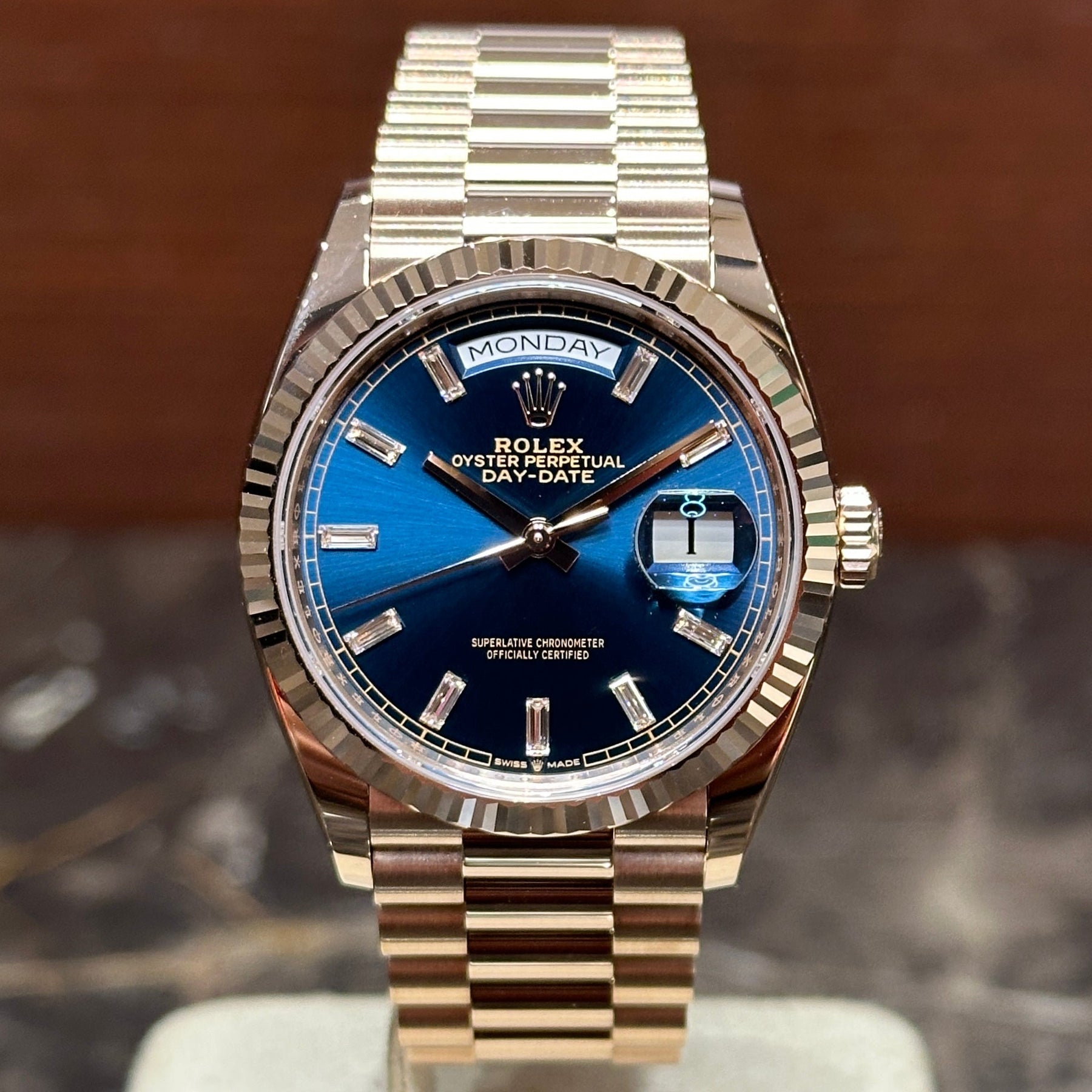 Rolex Day-Date 36 Rose Blue Baguette NEW 12/2024